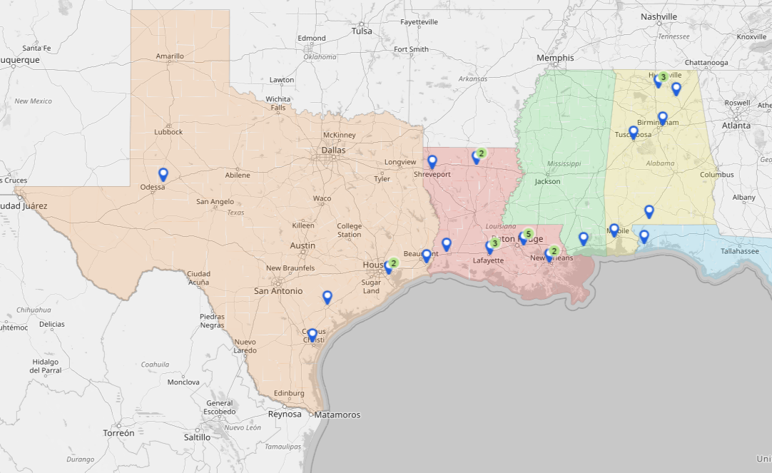 The Southern Division has 31 locations that span across Louisiana, Alabama, Mississippi, Texas, Florida and Iowa. The goals of these locations are to create an environment that provides equal opportunity, efficiency, and the ability to grow continuously within this business.